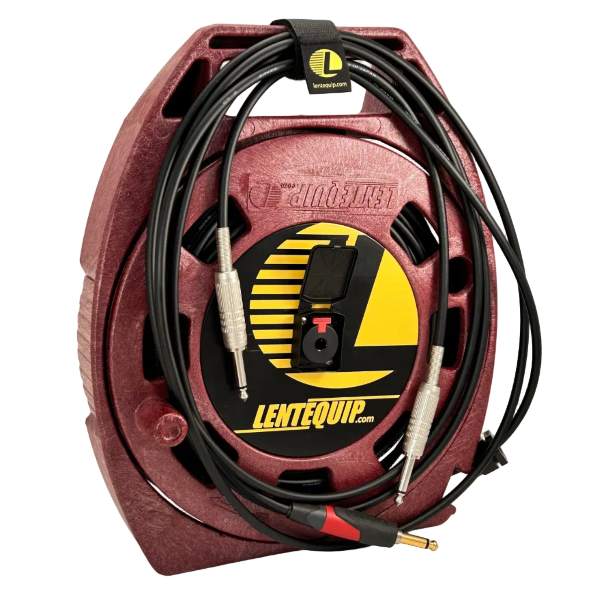 Introducing the latest addition to Lentequip's cable reel lineup (2026), engineered specifically for professional musicians. This assembly delivers 15 meters of Canare's premium high flex GS-6 oxygen-free cable with Canare's F-15 ¼" phono termination, paired with a 3-meter drop cable featuring Neutrik Silent connector (used on the instrument end) for seamless hot-swapping without powering down your amplifier. The reel hub incorporates a gold-contact Neutrik NJ3FP6C-B locking jack that secures the drop cable against accidental disconnection, while a protective dust cap preserves connector integrity during storage. Built on Lentequip's proven cable reel platform, this package combines reliable construction with the connectivity demands of modern performance environments.